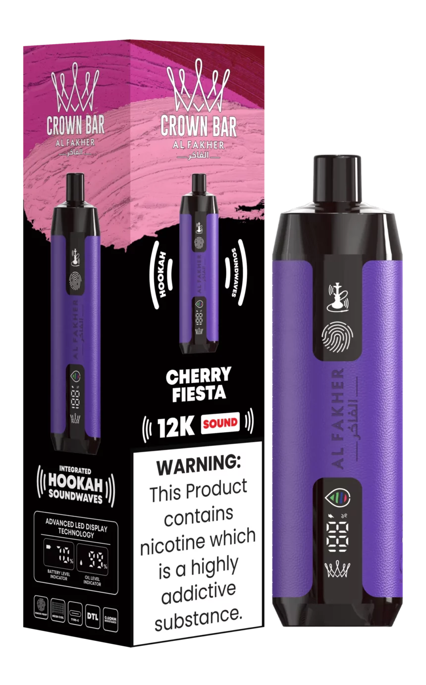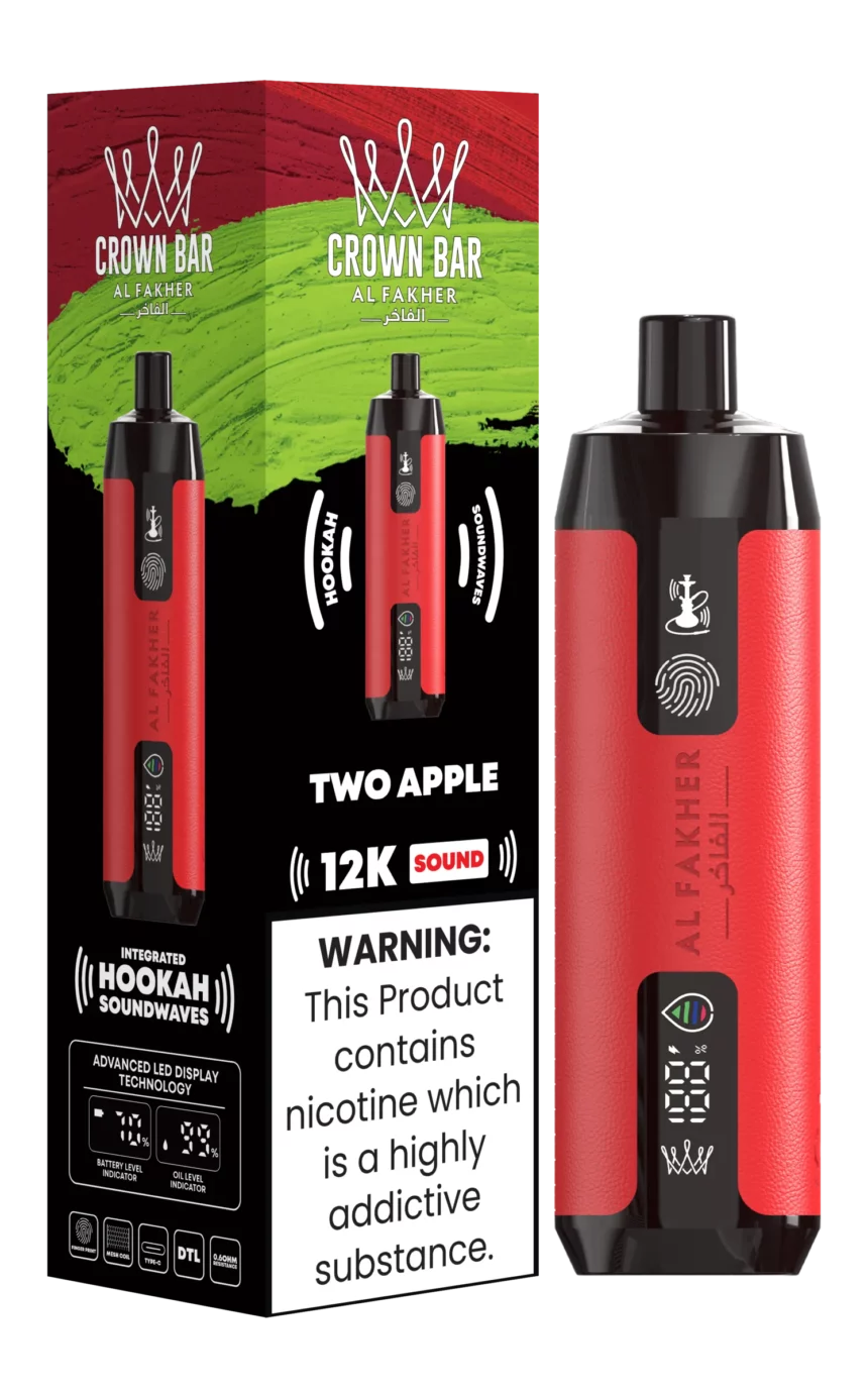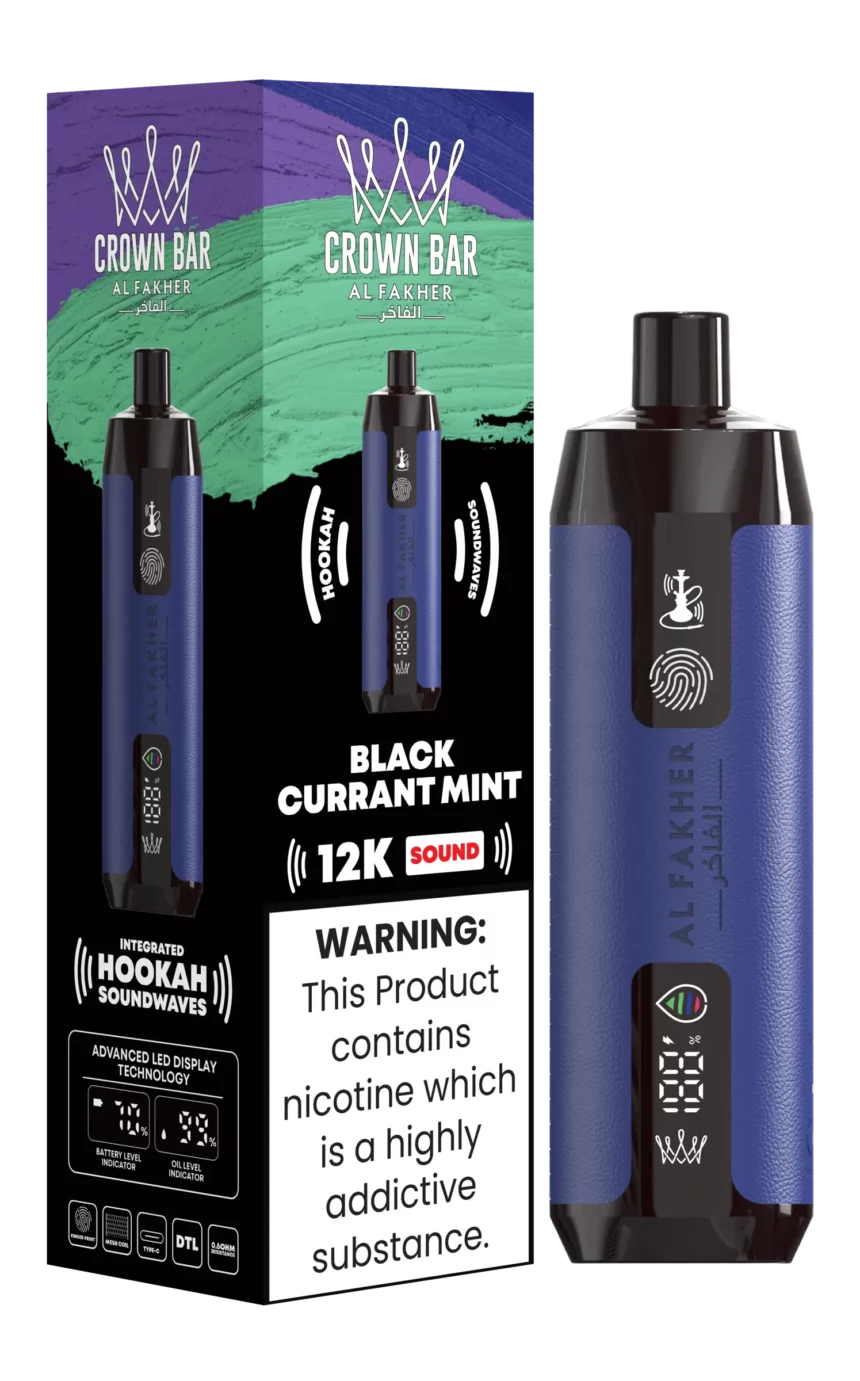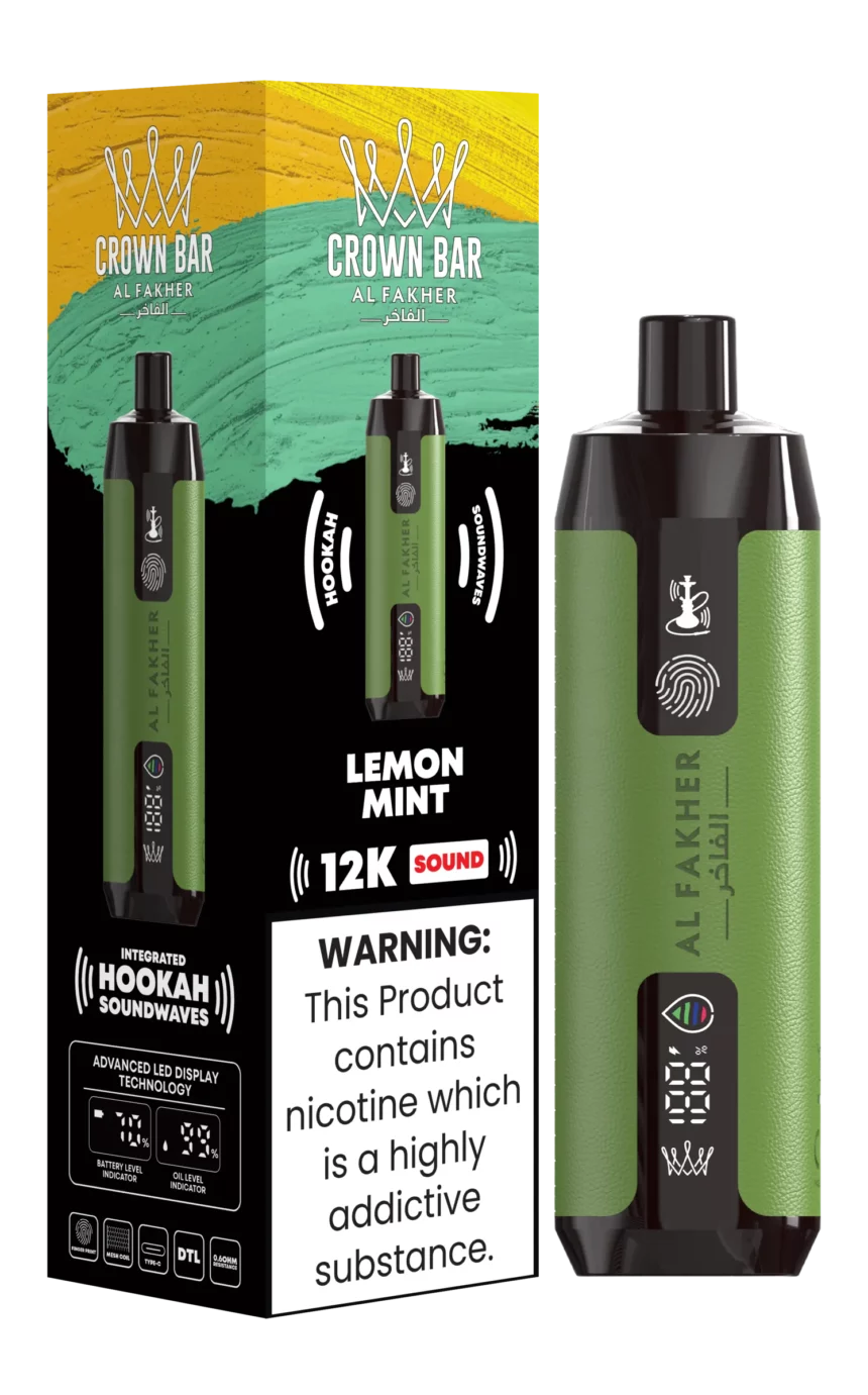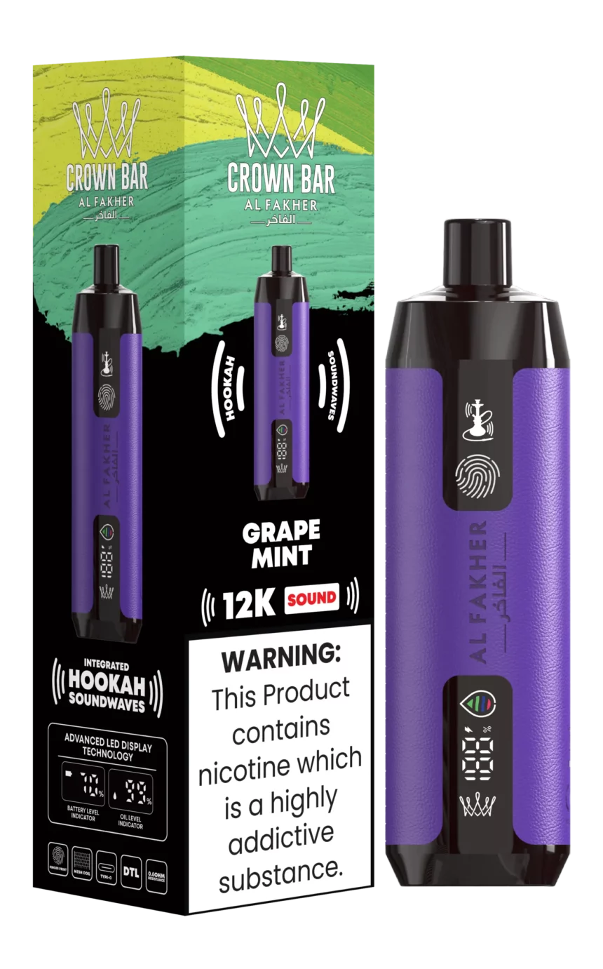Al Fakher Crown Bar 12000 Sound est un vaporisateur jetable avec une fonction intégrée qui imite le son de bouillonnement d’un narguilé traditionnel.