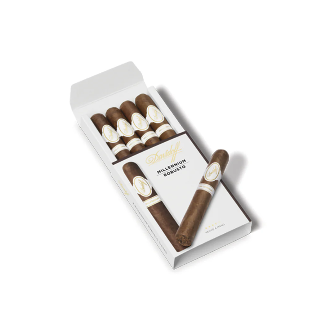 Plus intense et complexe, le Davidoff Millennium Blend Robusto séduit par ses arômes de cacao, café torréfié et épices. Conçu pour les amateurs exigeants recherchant profondeur et sophistication.